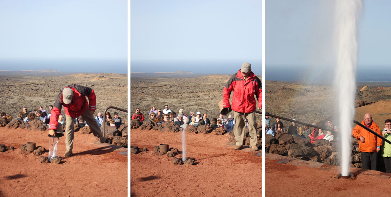 – El Parque Nacional de Timanfaya: para acceder a la zona preparada para la visita tenemos que comprar una entrada que cuesta 8 euros. Podemos seguir con nuestro vehículo hasta el Restaurante «El Diablo» (donde se cocina aprovechando el calor de la zona), construido por César Manrique, ubicado junto al lugar donde realizan las demostraciones geotérmicas (nos permiten comprobar la alta temperatura de la tierra, lo espectacular de los Géiser…). En esta zona, tomamos también un autobús (incluido en el precio de la entrada) desde el que nos muestran las formaciones más llamativas del terreno y nos explican sus orígenes.
