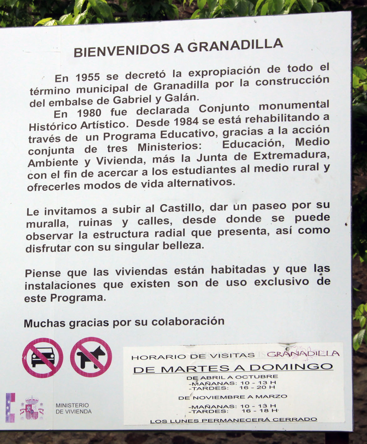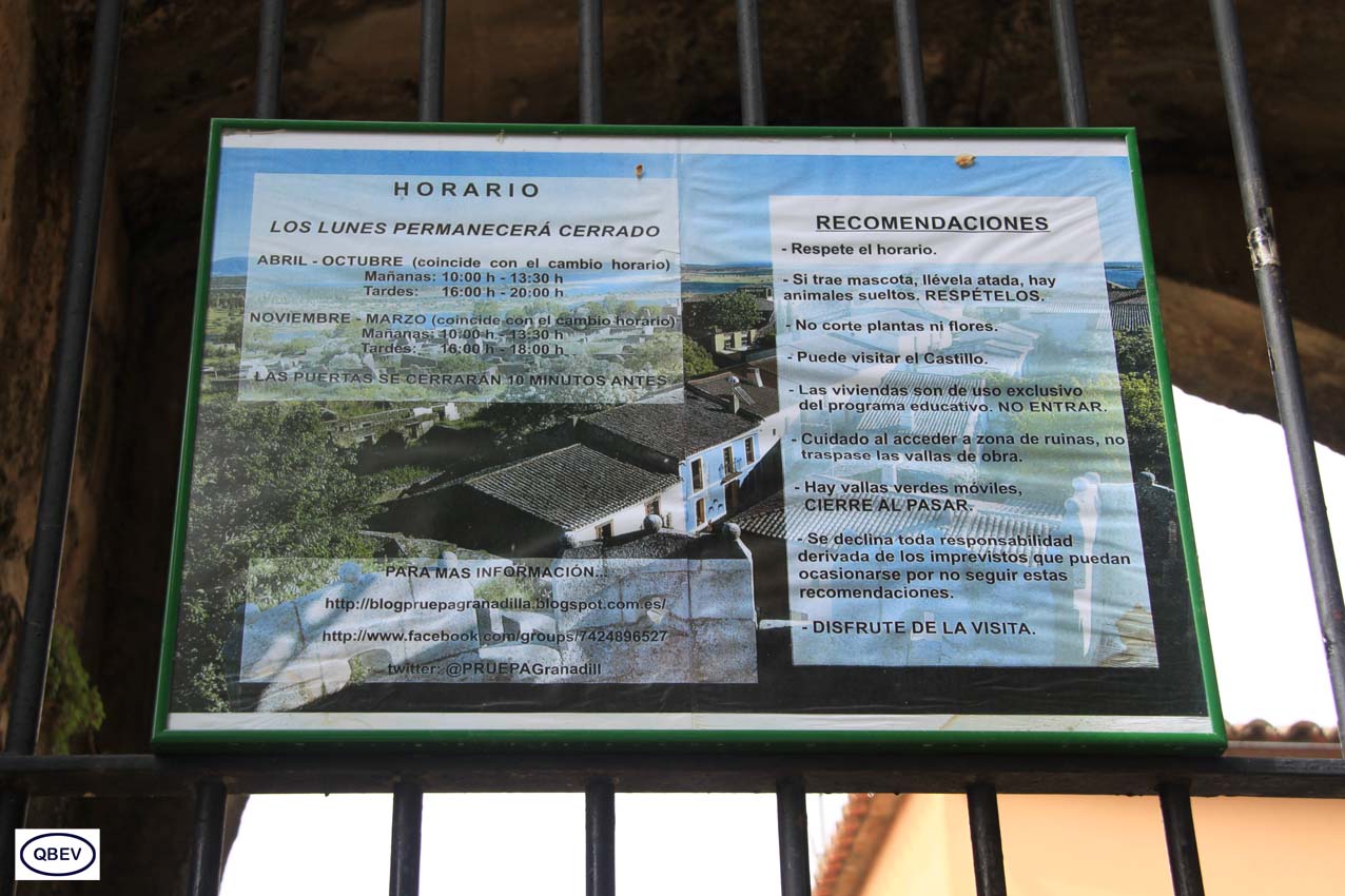 Para llegar hasta nuestro destino, nos dirigimos hacia Zarza de Granadilla y desde allí, tomamos una carretera con un tramo bastante difícil, que pide a gritos un arreglo urgente. Pero conduciendo con atención se supera sin problema y pronto alcanzamos nuestro objetivo. Allí nos recibe junto al castillo el siguiente cartel dispuesto a explicarnos la historia de Granadilla: